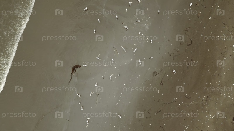 Вид сверху на чайки на берегу моря. Клип. Красивый песчаный пляж с волнами и стаями чайков. Песчаное побережье со стадами чайков и морскими волнами в солнечный день