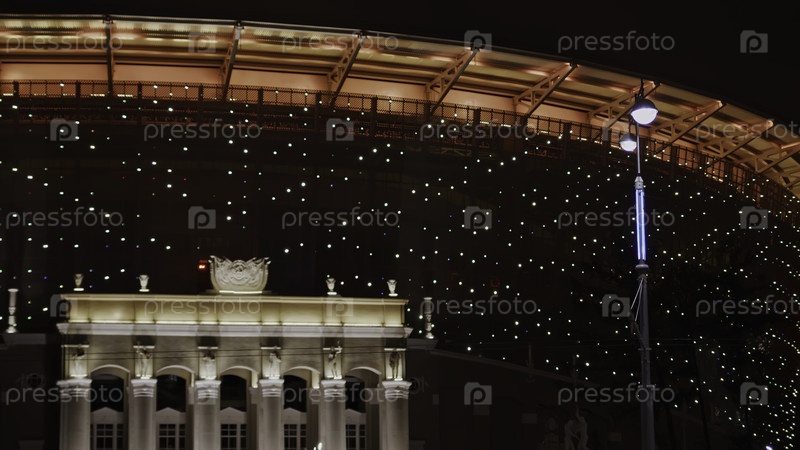 Просветленный ночной город со спортивной ареной и улицей