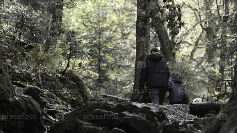 Семейные туристы наслаждаются осенней прогулкой по живописному, пышному лесу с высокими деревьями