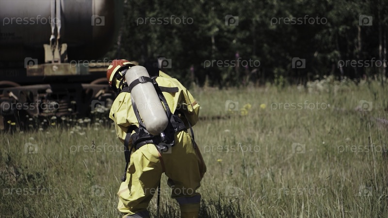 Мужчина в пожарном костюме на поле. Клип. Пожарный ставит знак о опасной зоне в метаинфекции. Место заражения после катастрофы с пожарным или спасателем