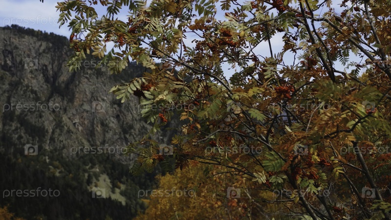 Красивое осеннее горное пепел в горах. Креативное. Рован на фоне осеннего леса и скалистой горы. Горная растительность с осенней лиственницей