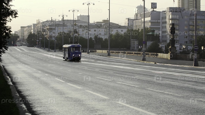 Спокойная и тихая городская улица во время восхода солнца, демонстрирующая одинокий автобус и блестящий мокрый тротуар под ним