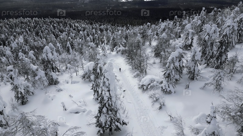 Вид сверху вниз пешеходов, идущих один за другим по зимнему лесу