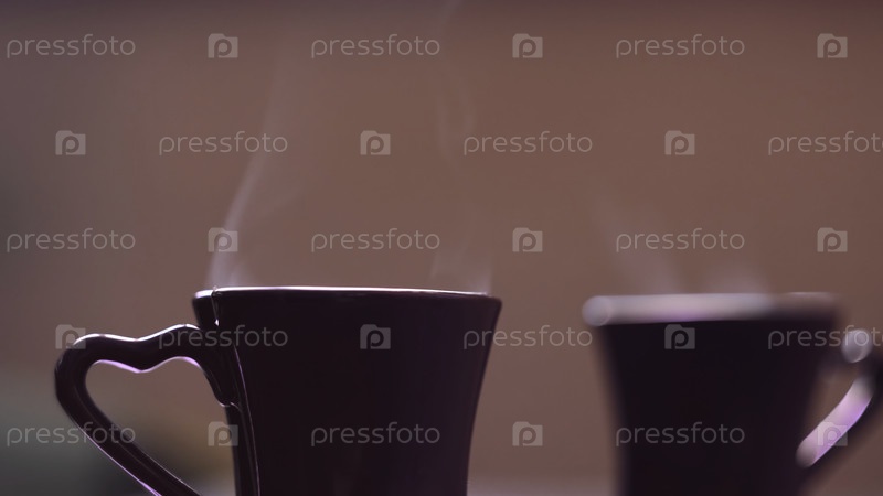 Ближайшее изображение парного горячего напитка в кружках. Концепция. Парные кружки с горячим напитком стоят и испаряются. Красивый пар поступает от парных кружек с горячим кофе