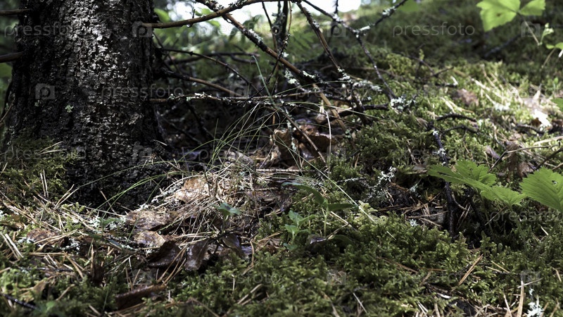 Близко к земле в лесу, покрытом зеленым мхом. летняя роща с засохшими влажными листьями, лежащими на земле