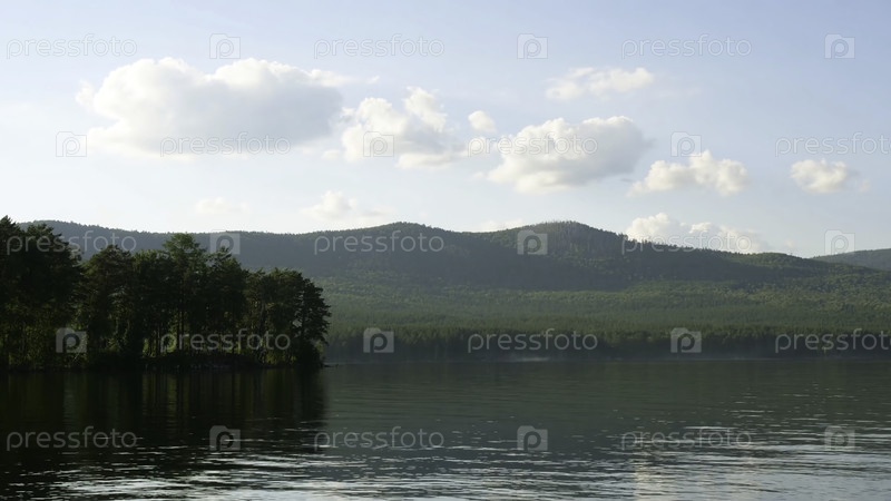 Летний пейзаж с рекой, облачным небом, лесом и солнечным таймелапсом. летний ландшафт с рекой и голубым временем неба. удивительные облака на берегу озера
