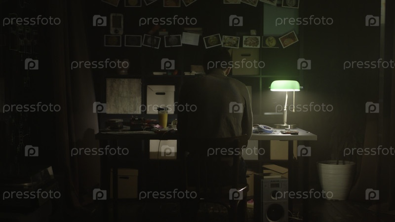 Усталый молодой человек, работающий с ноутбуком дома по вечерам. Сток. Трудный одинокий мужчина сидит за столом дома. Понятие одиночества