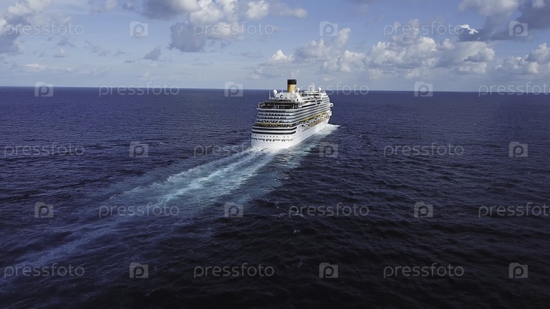 Задняя часть круизного лайнера и его красивый след на голубой морской поверхности, пейзаж моря. Сток. Вид с воздуха на прекрасный белый круизный лайнер в солнечный день на фоне синего облачного неба