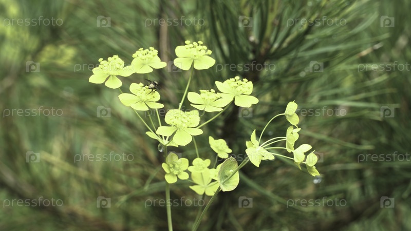 Ближайший снимок маленькой мухи, сидящей на зеленом цветке чистого воска на фоне веток сосны