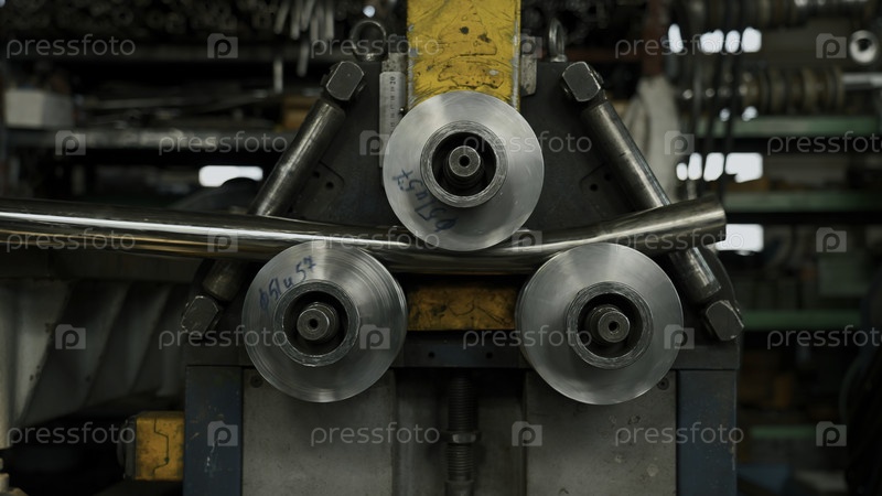 Промышленная машина для изгиба холодной металлической трубы в индустриальном зале на производственном заводе.Креативное. Концепция тяжелой промышленности