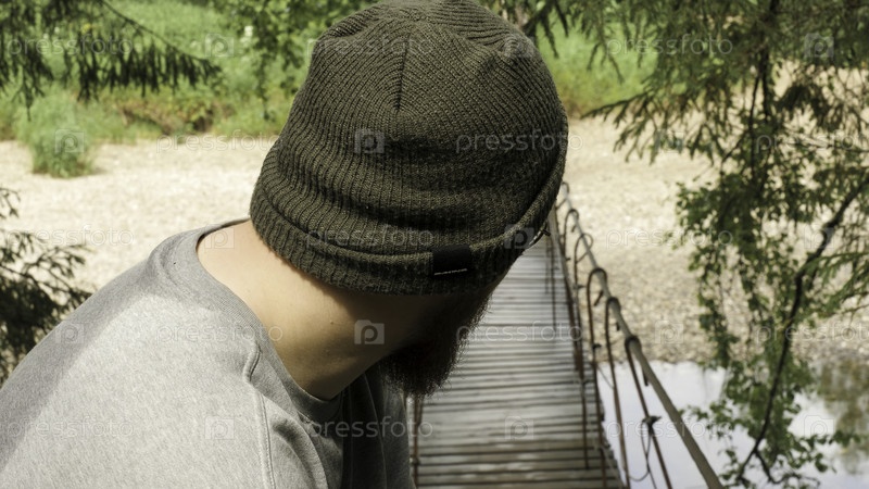 Ближайшее изображение бородатого мужчины в шляпе, который смотрит на деревянный мост через реку.Летние походы, туристы наблюдают за подвесным мостом