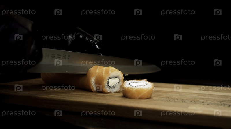Руки в черных перчатках режут филадельфийский рулон острым ножом на деревянной доске, изолированный на черном фоне