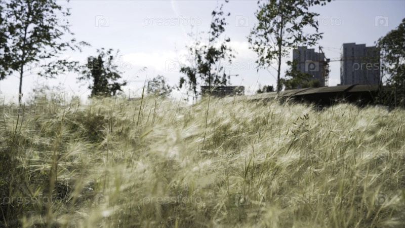 Поле пернатой травы на фоне городских зданий и растущих деревьев. ближайший снимок молодой пернатой травы в солнечном свете против голубого неба