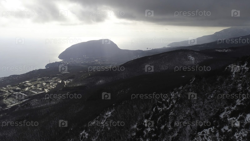 На склоне высокого скального массива, покрытого соснами в туманных облаках. В воздухе для лесистого горного склона в тяжелых серых облаках и береговой линии с небольшим городом
