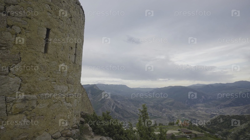 Каменные стены руин старого города. Действие. Исторические руины старого каменного города в горах. Заброшенный каменный город на фоне горного пейзажа