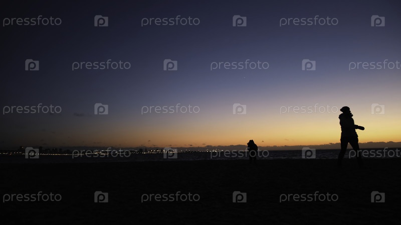 Близкий план силуэтов матери и ребенка, идущих вблизи побережья Финского залива на фоне вечернего неба и городских ночных огней.Концепция.Прекрасный закат над Финским заливом