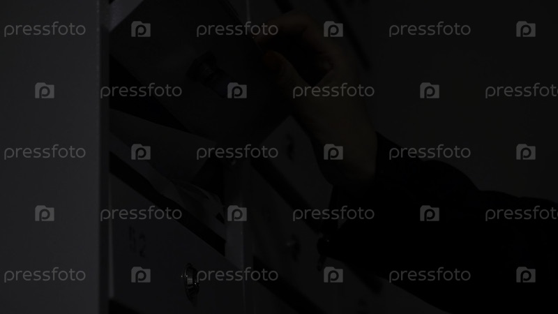Закрытие металлических новых почтовых ящиков у входа в дом.Концепция.Женщина руками принимает письмо из почтового ящика