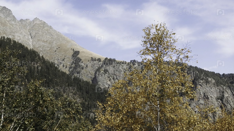 Желтая яркая осенняя береза и гора на фоне.Креативное.Природный лесистый ландшафт