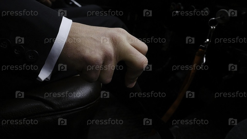 Бизнесмен едет на работу, рукой переключает коробку передач. Бизнесмен переключает трансмиссию в редкой машине. Бизнесмен управляет автомобилем, рукой переключая коробку передач. Ретро стиль