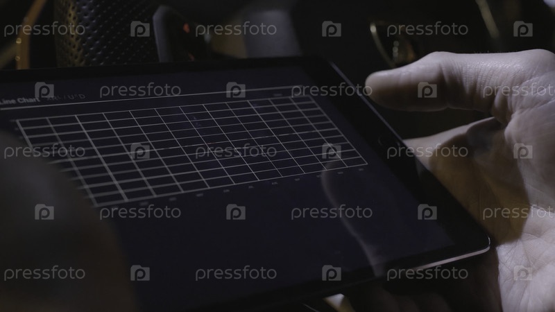 Бизнесмен, анализирующий финансовую статистику, отображаемую на экране планшета. Акции. Близкий снимок планшетного компьютера с графиками, схемами и диаграммами на экране в руках. Отчет, маркетинг, бизнес