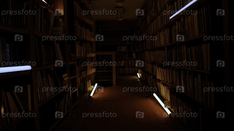 Темная библиотека. Запасные кадры. Комната с большими шкафами, где есть книги и журналы и играющие огни в темноте. Высокое качество 4k-записи
