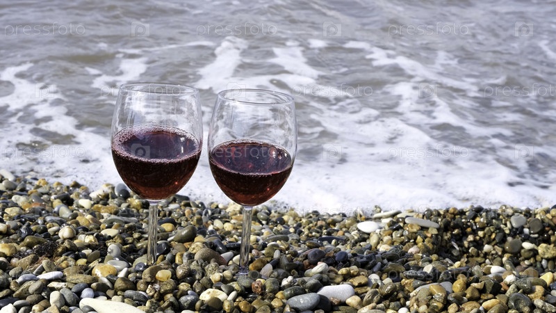 Романтический день со стаканами красного вина, стоящими на пляже в солнечный день.Два прозрачных бокала с красным вином на галечном пляже с волнами и морем на заднем плане