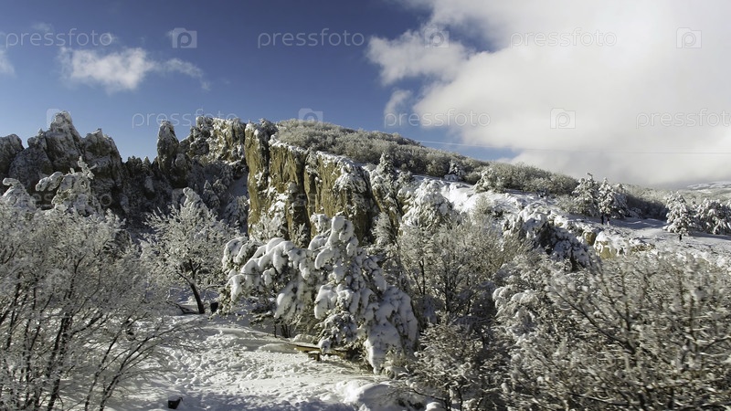 Фантастический зимний пейзаж высоких гор и заснеженного леса на фоне облачного, голубого неба. солнечный день в белом цвете, зимние скалы и деревья, покрытые снегом против яркого неба