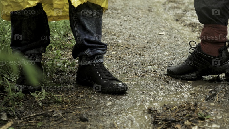 Люди прогуливаются по лесу под дождем. Фотографии. Ближайшее изображение мужских ног, стоящих на влажном лесном грунте с падающими капельками дождя