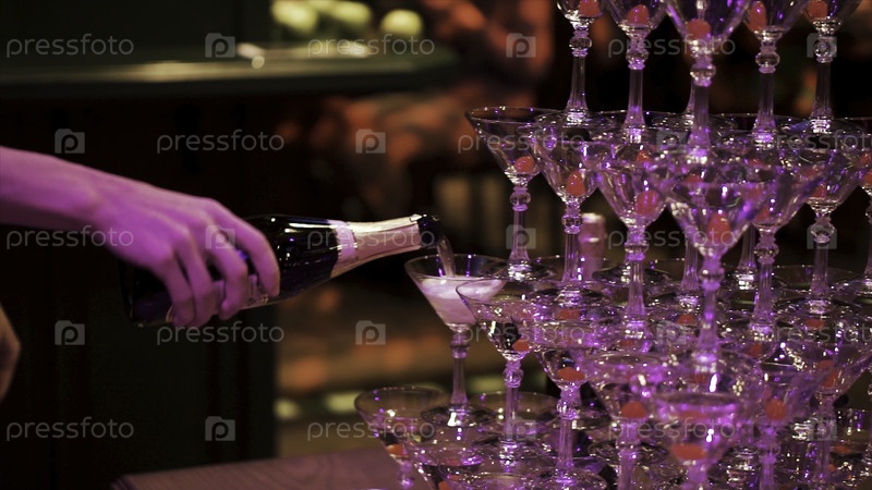 Официант рукой со стаканом шампанского над пирамидой во время общественного питания на вечеринке Пирамида бокалов шампанского