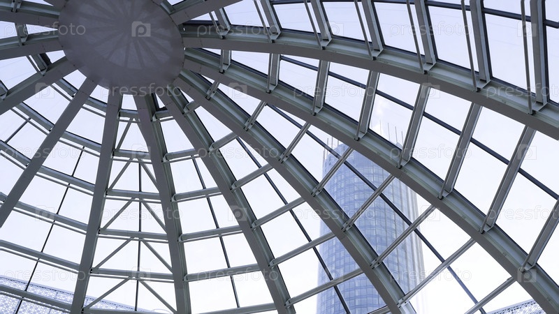 Стеклянный купол современного здания. Вид изнутри комнаты. Легкая конструкция прозрачной крыши, сделанная из круглых стальных труб. Архитектурный фон. Стеклянный купол изнутри на фоне небоскреба