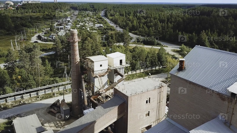 Фабрика с кирпичным дымовым комнем на фоне деревни. Фотоаппаратные кадры. Вид сверху кирпичной фабрики с дымом на фоне города со зеленым лесом летом