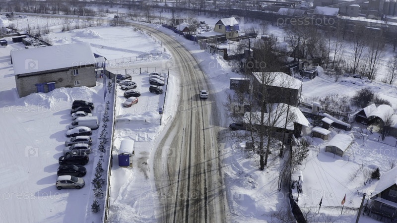 Вид с воздуха сельской дороги, покрытой снегом. Клип. Летающий над сельской дорогой и деревней