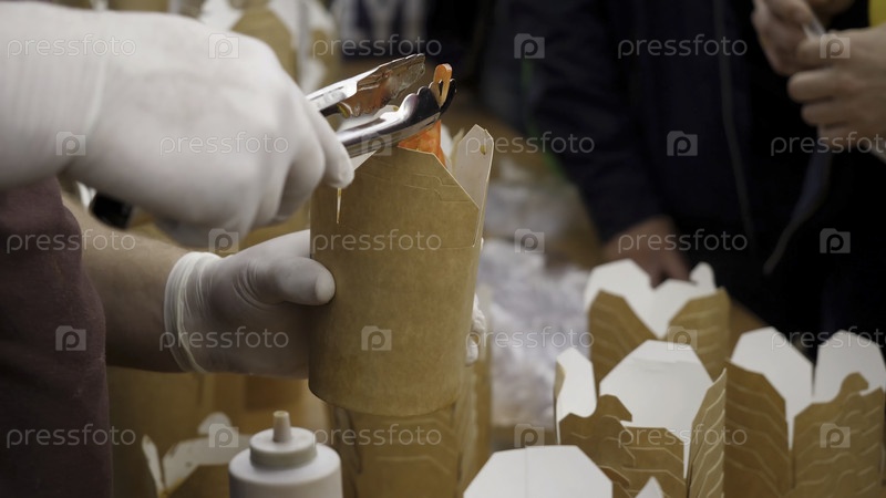 Руки кладут контейнер с едой на вынос, крупный план. доставка пищи. близкий план шеф-повара, подающего одну порцию перемешаных жареной лапши в китайской коробке