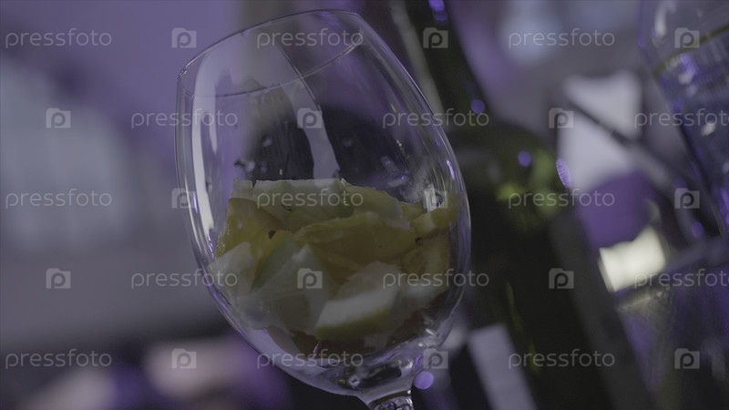 Освежающая сангрия, пунш с фруктами и красное вино заливают в стакан замедленным движением. Рамка. Стакан с цитрусовыми плодами заполняется красным вином