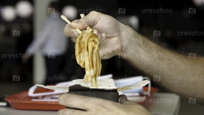 Ближайшее изображение мужских рук с помощью деревянных китайских палочек, которые едят вкусные азиатские лапши вока. СМИ. Боковой вид употребления в пищу китайской макаронки в общественном месте