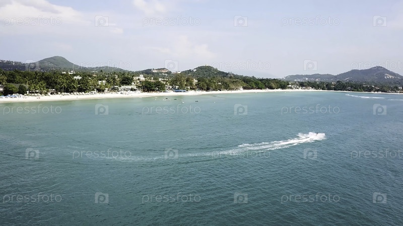 Вид с воздуха белого песчаного пляжа и реактивного лыжного спорта на акваморье голубой лагуны