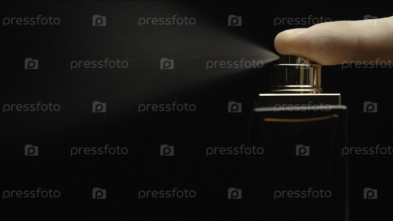 Cinemagraph - Ближайший план капли из спрейной бутылки на черном фоне. Мужская парфюмерная бутылка на темном фоне. Ближний план каплей из спрейной бутылки на черном фоне