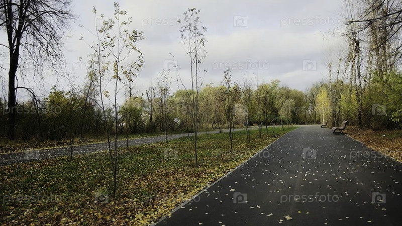 Пустая скамейка в парке осенью.Клип.Желтые листья на земле городского парка