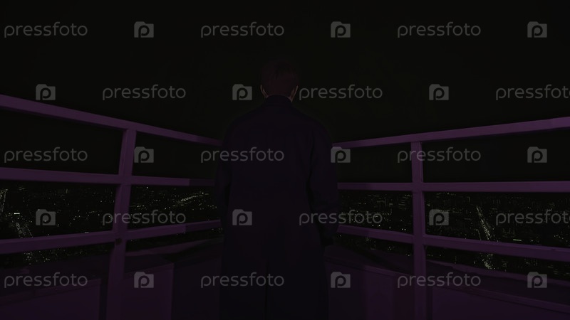 Молодой человек ночью стоит на крыше здания СМИ Красивый мужчина в пальто стоит на крыше многоэтажного дома Фотосессия человека на крыше многоэтажного дома