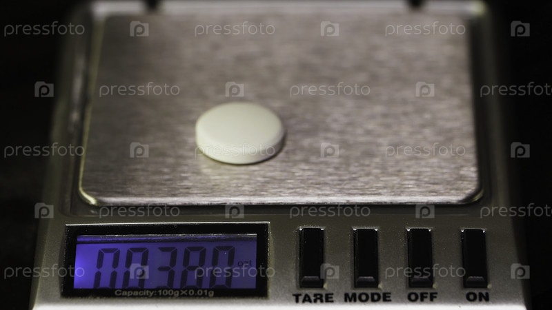 Фармацевт взвешивает изготовленные таблетки на контрольных весах, пилюли для похудения - на весовой шкале