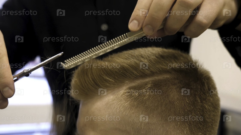 Близкий план мужских ножниц для стрижки волос в салоне красоты.Мастер срезает волосы и бороду мужчин в парикмахерской, фризер делает прическу молодому человеку.Близкий план Человек в салон