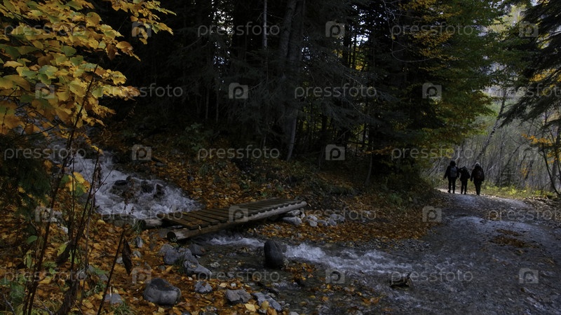 Красивый ручей в горах, скалы покрытые мхом, красочные листья.Креативное мышление.Путешественники гуляют осенним лесом