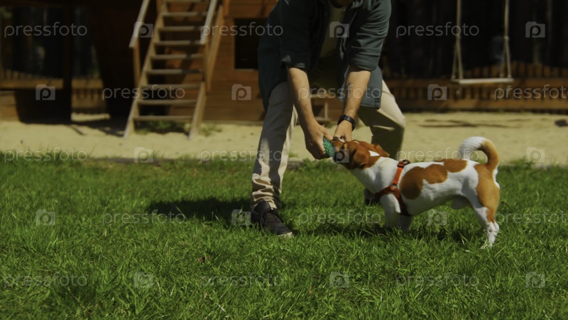 Человек активно играет с собакой на траве. Файлы кадров. Активное отдых с собакой в парке в солнечный летний день. Мужчина играет в мяч с собакой на зеленой траве в парке