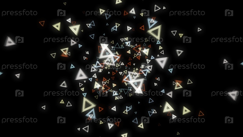 Компьютерное создание абстрактного пространства. Анимация. Абстрактный фон многочисленных разноцветных неоновых треугольников, плавающих на черном
