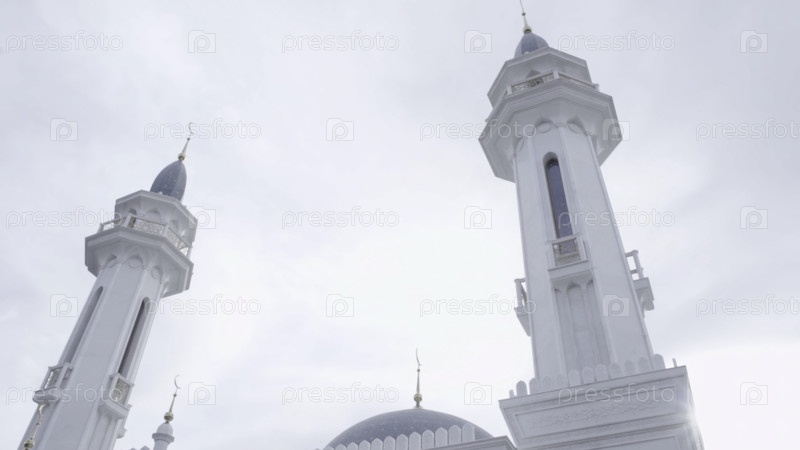 Бело-серая историческая мечеть. Сцена. Религиозное здание с минаретами на фоне облачного неба