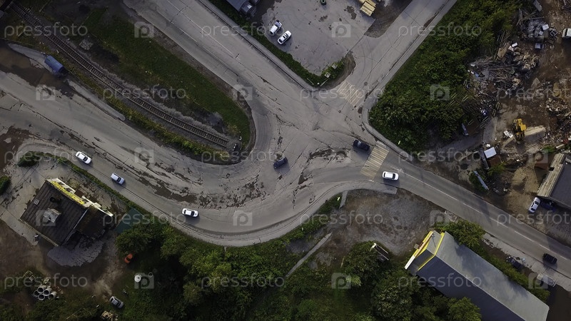 Вид с высоты. Клип. Небольшая вилка на дороге автомобилей с быстро движущимися транспортными средствами. Высококачественная запись 4k