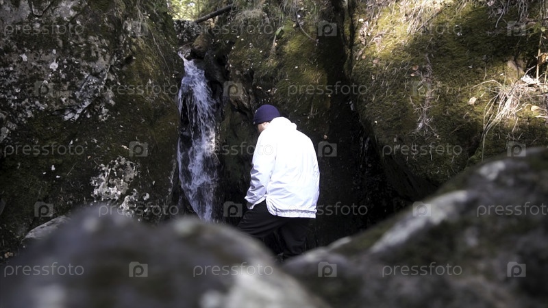 Сзади мужчина в белом пиджаке, спускающийся к водопаду в горном ущелье.Турист стоит на камнях и смотрит на поток падающей воды в овраге
