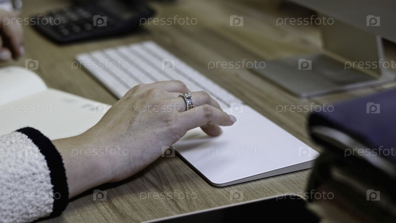 Близкий план элегантной женской руки с кольцом на пальце, печатающей на белой клавиатуре.СМИ.Режиссер работает у компьютера