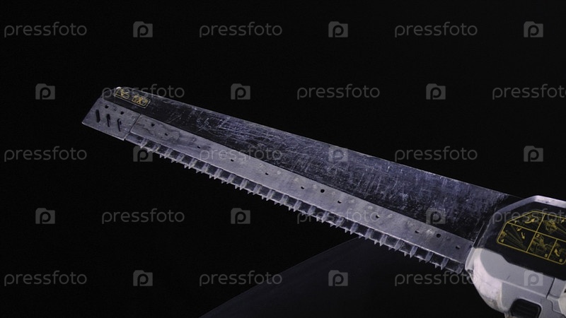 Близкий план мощной электрической лезвии пилы на черном фоне.Стоковые кадры.Большая электропила для профессионального плотничества