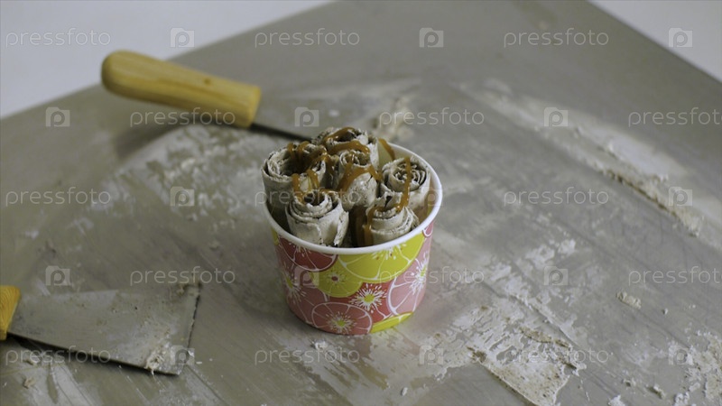 Изолированное фруктовое мороженое. Клип. Ближайший взгляд сверху. Тайское мороженое - фантастический десерт. розеты из мороженого, покрытые всевозможными ингредиентами. Жареное тайское мороженое в Таиланде